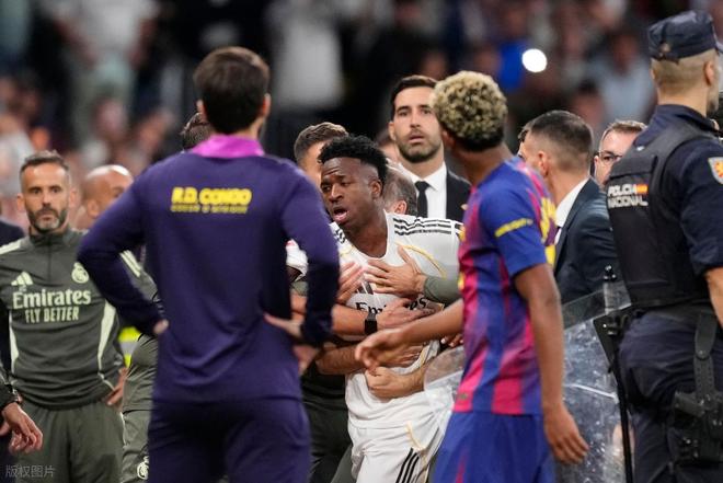 易边再战还是皇马稍占上风,开场仅5分钟,贝林厄姆右路强行突破杀入禁区倒三角回传,加西亚滑铲过来将球挡下,皮球击中贝林厄姆膝盖又弹出去打到加西亚手上。主裁在VAR确认后吹罚了点球,姆巴佩操刀主罚未能把握住梅开二度的绝佳机会,大力兜射打得太正被什琴斯尼奋勇扑出。巴萨这边苦攻无果,赛前英勇无比的亚马尔不是带球带丢,就是射门高射炮打飞机,到了补时最后时刻他们反倒是热闹起来,先是佩德里爆铲楚阿梅尼,几乎是压哨领到黄卡,2黄变1红被罚下。之后就是亚马尔的表演,本场近乎隐身的他要和皇马球员约架,被提前换下场的维尼修斯本就火大,一下子从替补席冲过来,后被众人拦下。最终巴萨客场1:2不敌皇马,近3轮比赛输了2场。